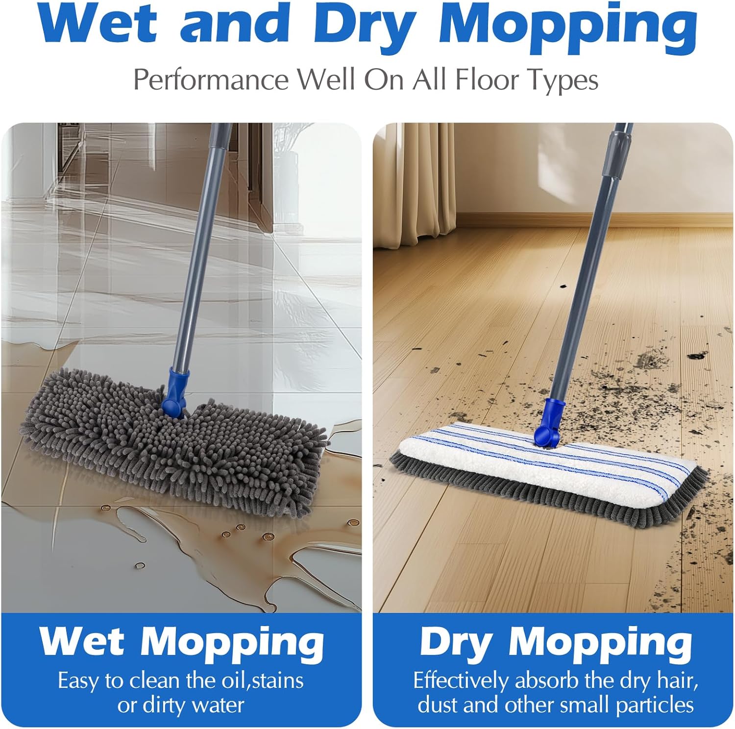 • Dual-Sided Magic Mop: Flip & Clean Smarter, Not Harder!Flip-to-Clean Technology.No more switching tools!Dry Side (Plush Chenille): Instantly captures dust, crumbs & pet hair like a magnet.Wet Side (Absorbent Microfiber): Locks in spills, scrubs grime & leaves floors streak-free.