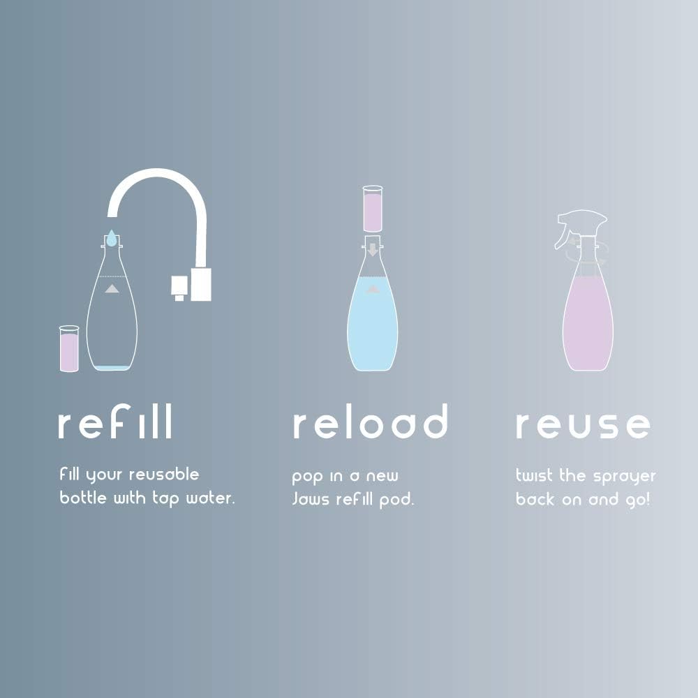 - JUST ADD WATER: Fill the Reusable Bottle with water, insert the JAWS Refill Pod and apply the trigger sprayer to release concentrate.