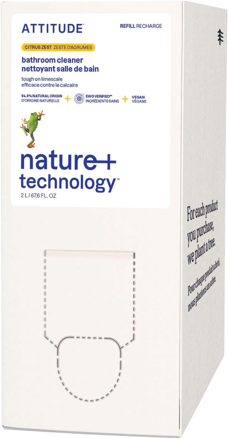 ATTITUDE Bathroom Cleaner Spray Refill, EWG Verified, Plant-Based & Vegan, Safe for Bathroom Surfaces, Tiles, Tubs, Shower Walls, and Grout, Citrus Zest Scent, 67.6 Fl Oz