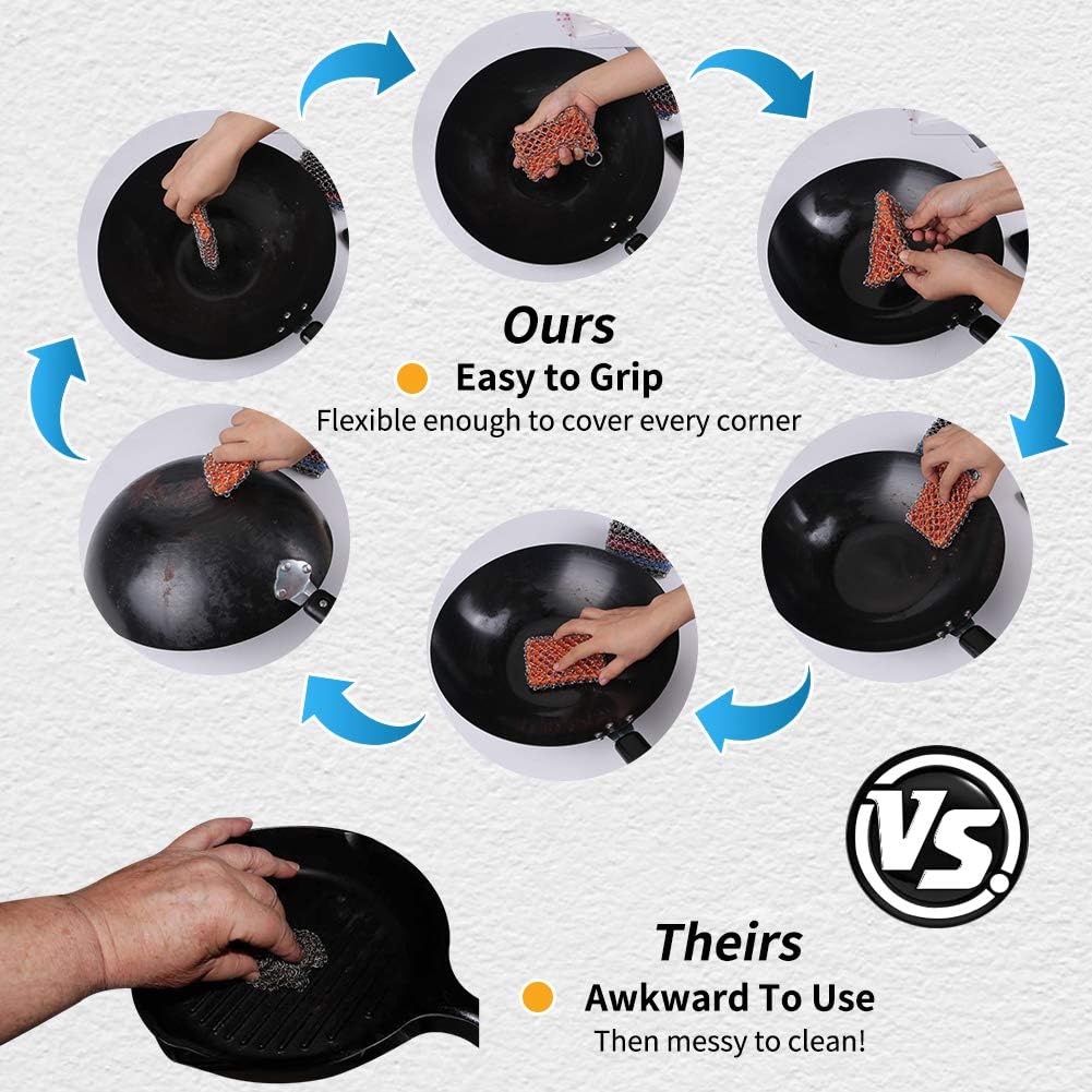 - 【How to clean a skillet?】Scrub the cast iron, skillet,and other stubbon built up,grease under warm water, rinses with clean water then let it dry. Convenient hanging ring on this cast iron cleaner chainmail scrubber allow easy storage. 6 Colors available.