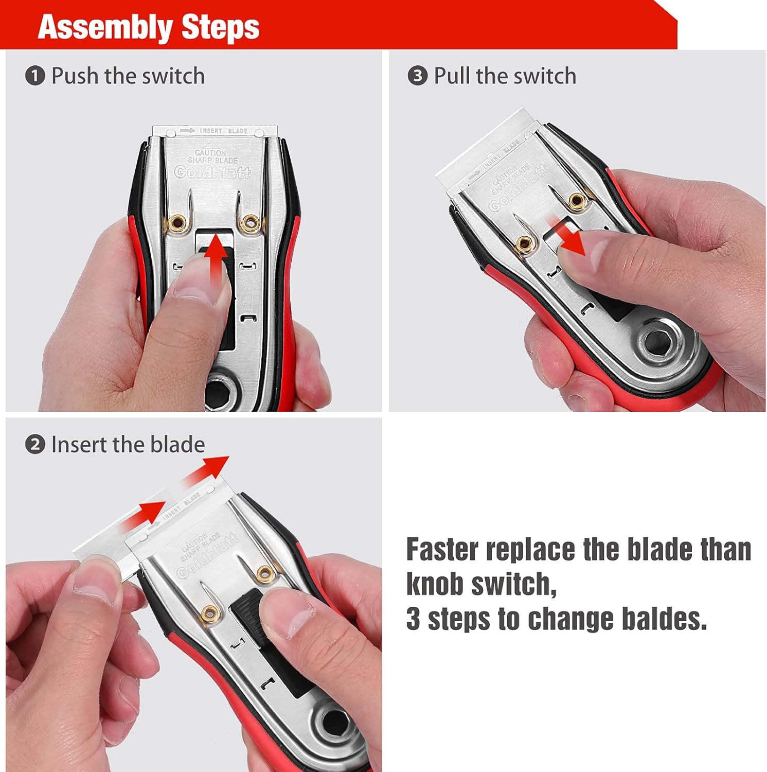 - Easy Assembly: Unlike other scrapers that use knob to assemble blades, Goldblatt scraper set just need to pull and push the switch to replace the blades, No worry about losing knob or bolt. Slot design will securely fix the blades in place for safety use