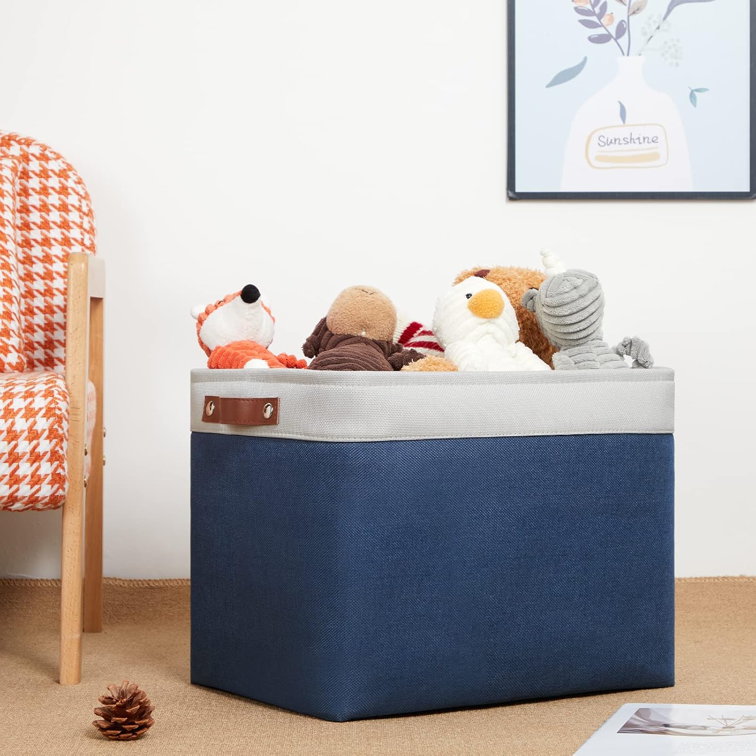 - 【Material】These storage baskets are constructed of wear resistant and attractive linen & EVA with linen interior lining. The sturdy leather handles make it easy to carry or pull off and out of shelves. DULLEMELO baskets for storage with a sturdy metal rod frame around the top to keep the storage bins shape.