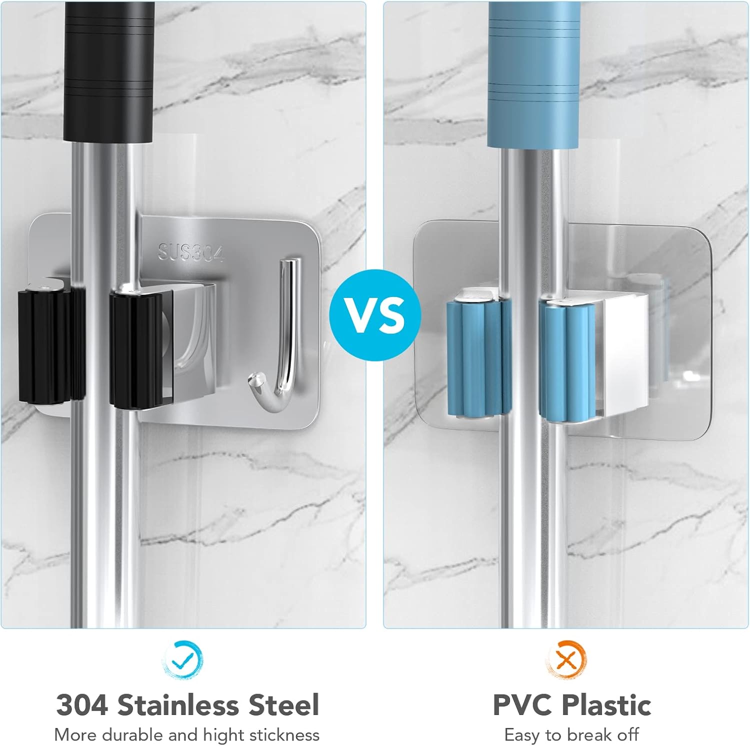 - ā Waterproof: HOMEASY self-adhesive broom holder wall mount is made of high quality SUS304 stainless steel, waterproof and rustproof. Triangle-buckle & petal-shaped gear adjust size automatically based on different thickness of the handles to prevent object slipping. Can stand up to 10 KG, more strong and sturdy than plastic holder