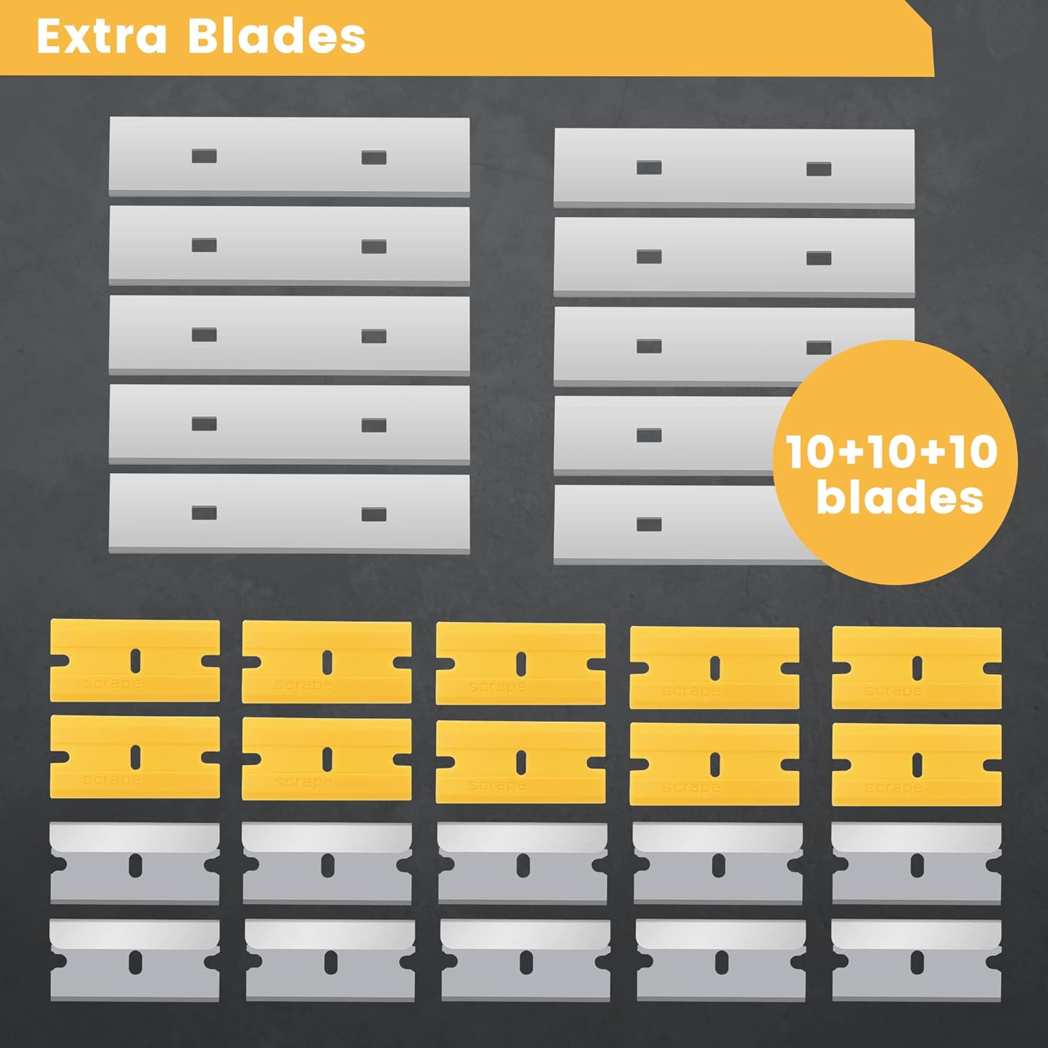 - SCRAPER TOOL SET: 1Pack 4" Glass Scraper, 1Pack standard Window Scraper, 1Pack mini Blade Scraper, 10pcs 4" razor blades, 10pcs standard metal razor blades, 10pcs plastic razor blades.With it, it can meet all your needs, it is the most comprehensive and indispensable set combination