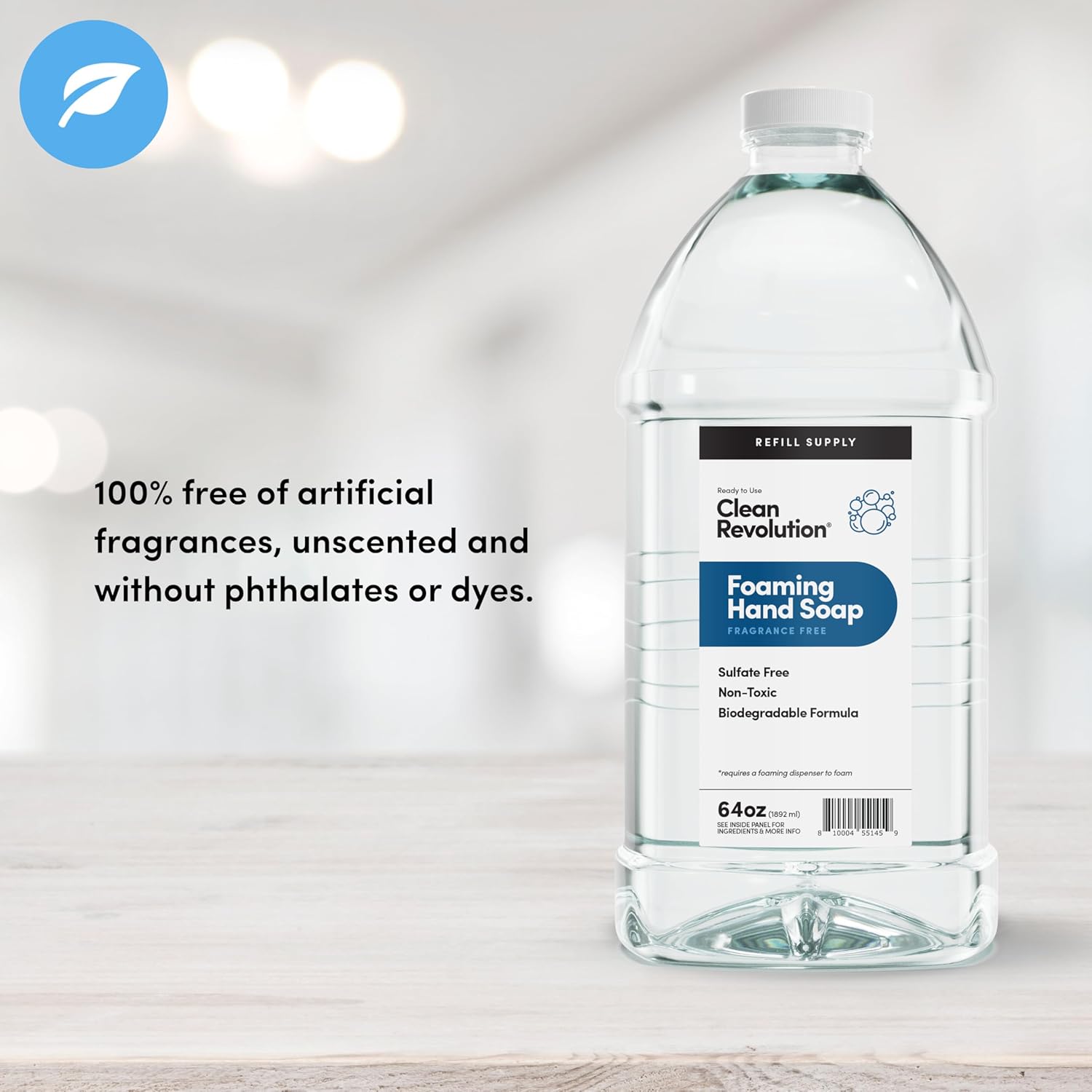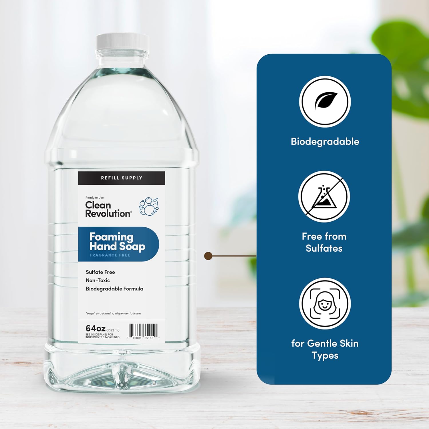 - REFILL & REUSE: Our Refill Supply container delivers exceptional value with 128 ounces of ready to use liquid foam soap designed to be used with Clean Revolution Refillable Foaming Hand Soap dispenser. This gallon jug has more than 8 refills, eliminating the need for individual single-use bottles and creating less plastic waste. Foaming Hand Soap dispenser sold separately.