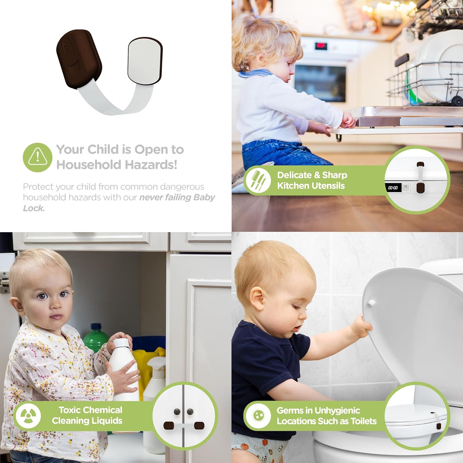 - What You Get: 2 multi-purpose cabinet locks that has a high grade 3M adhesive. Flexible strap means you can bend around items from toilet seats to fridges