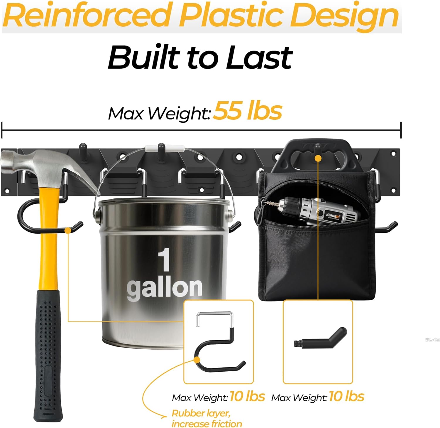 - 【High Strength Structure】 Made of high quality ABS plastic, this wall mount tool organizer supports up to 55 lbs in total (10 lbs per hook), making it ideal for storing heavy duty tools like shovels, rakes, and mops—perfect for any durable garage storage system.