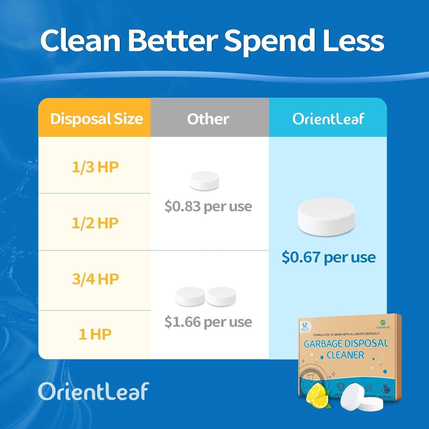 - Powerful 20g Cleaning Tablets β OrientLeaf XXL size tablets, no need to use multiple pods for one cleaning session! Each tablet is perfectly sized compatible with kitchen waste dispoal models including InSinkErator, Waste King, Moen, KitchenAid, Whirlpool, GE, Frigidaire, Emerson, Kenmore and more