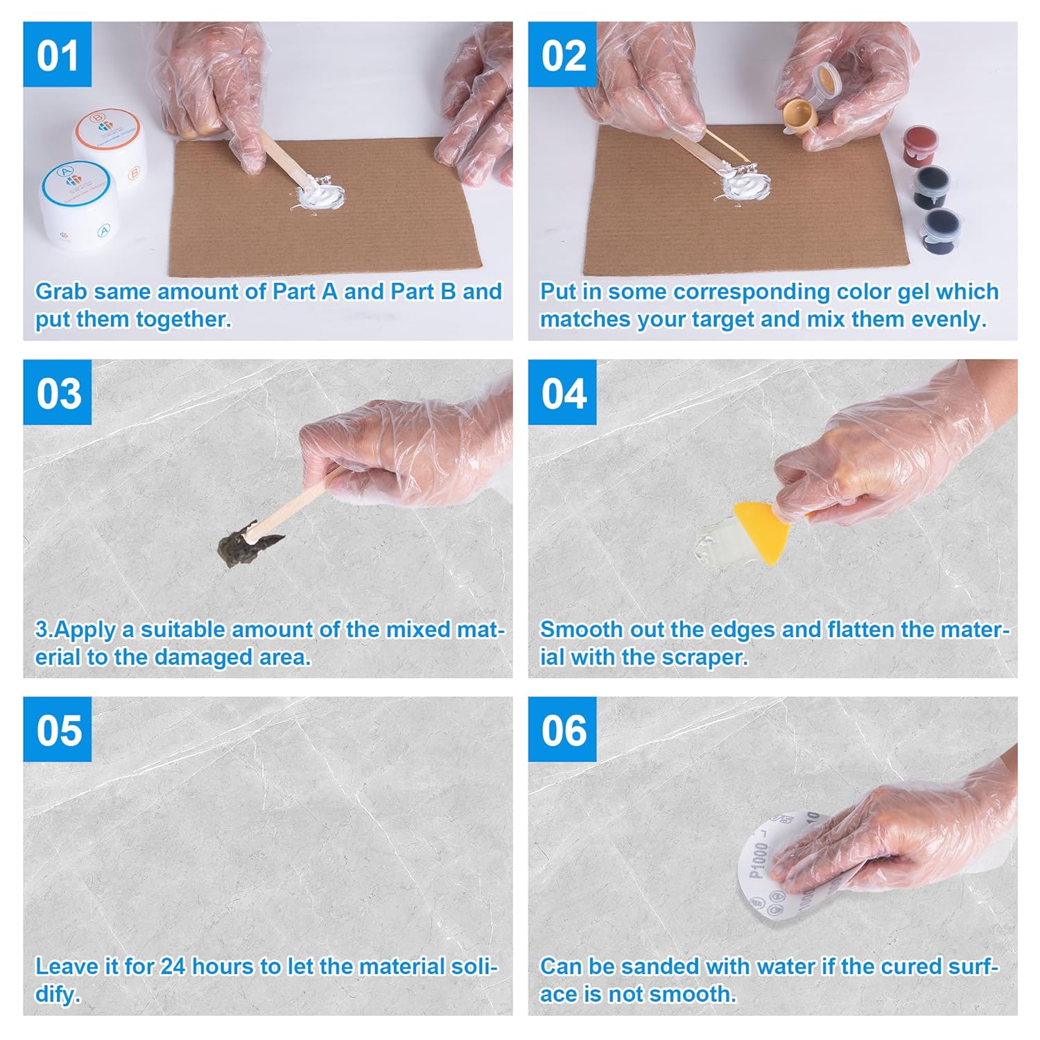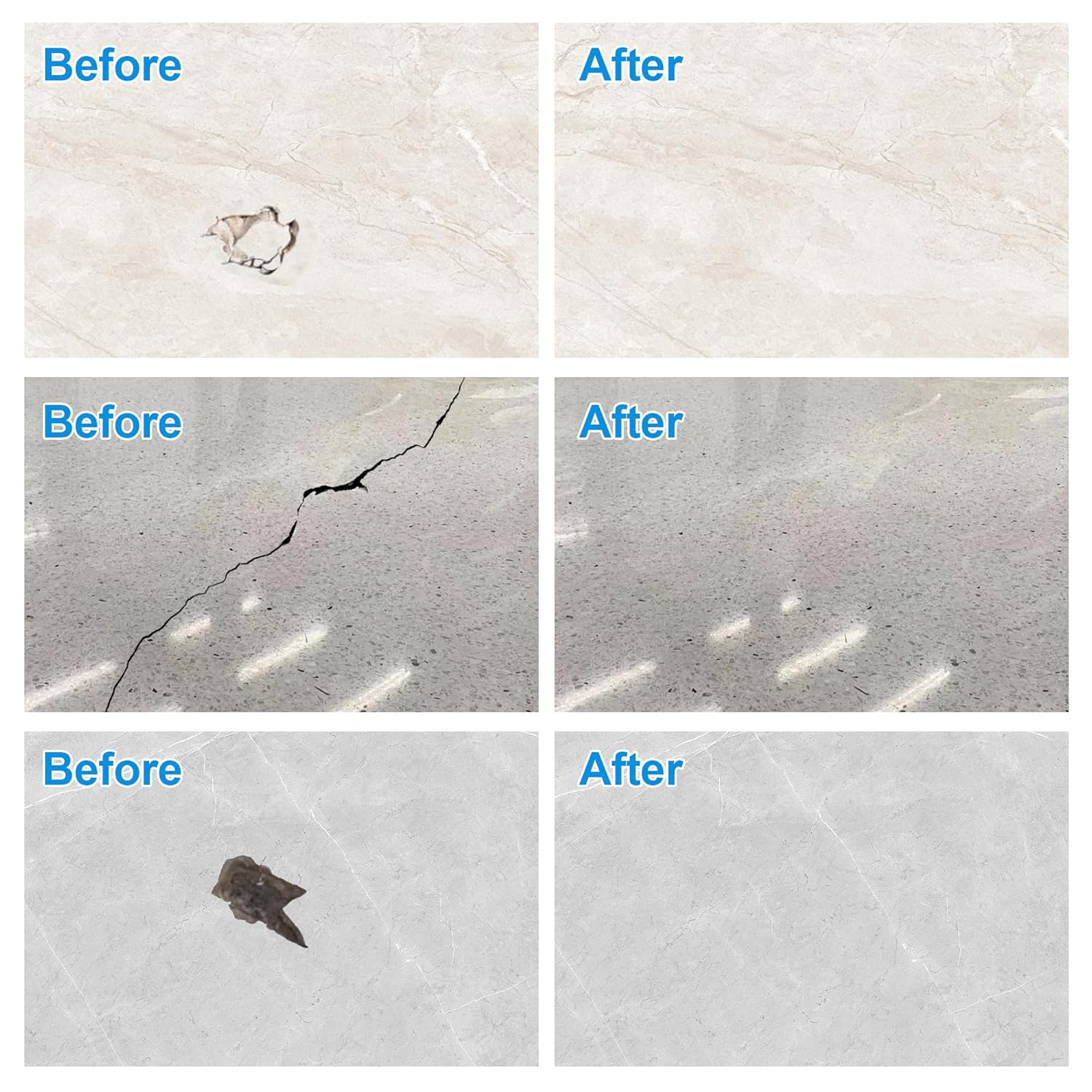 - Multi-Surface Versatility β Our repair kit is designed not just for marble but also for granite, quartz, porcelain, ceramic, travertine, limestone, slate, sandstone, acrylic, fiberglass, and more. It effectively restores countertops, sinks, bathtubs, tiles, and even dinnerware, making it an essential solution for household and commercial repairs.