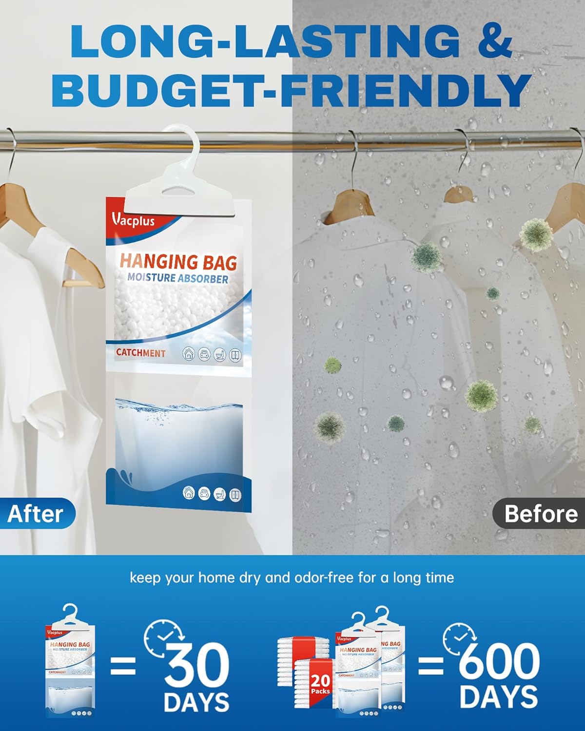 - EASY And SAFE: Vacplus moisture absorber packets provide an easy solution to protecting items and fabrics from excess moisture. By Hanging them up, physical dehumidification gives you a Safe, Green & Energy-saving life.