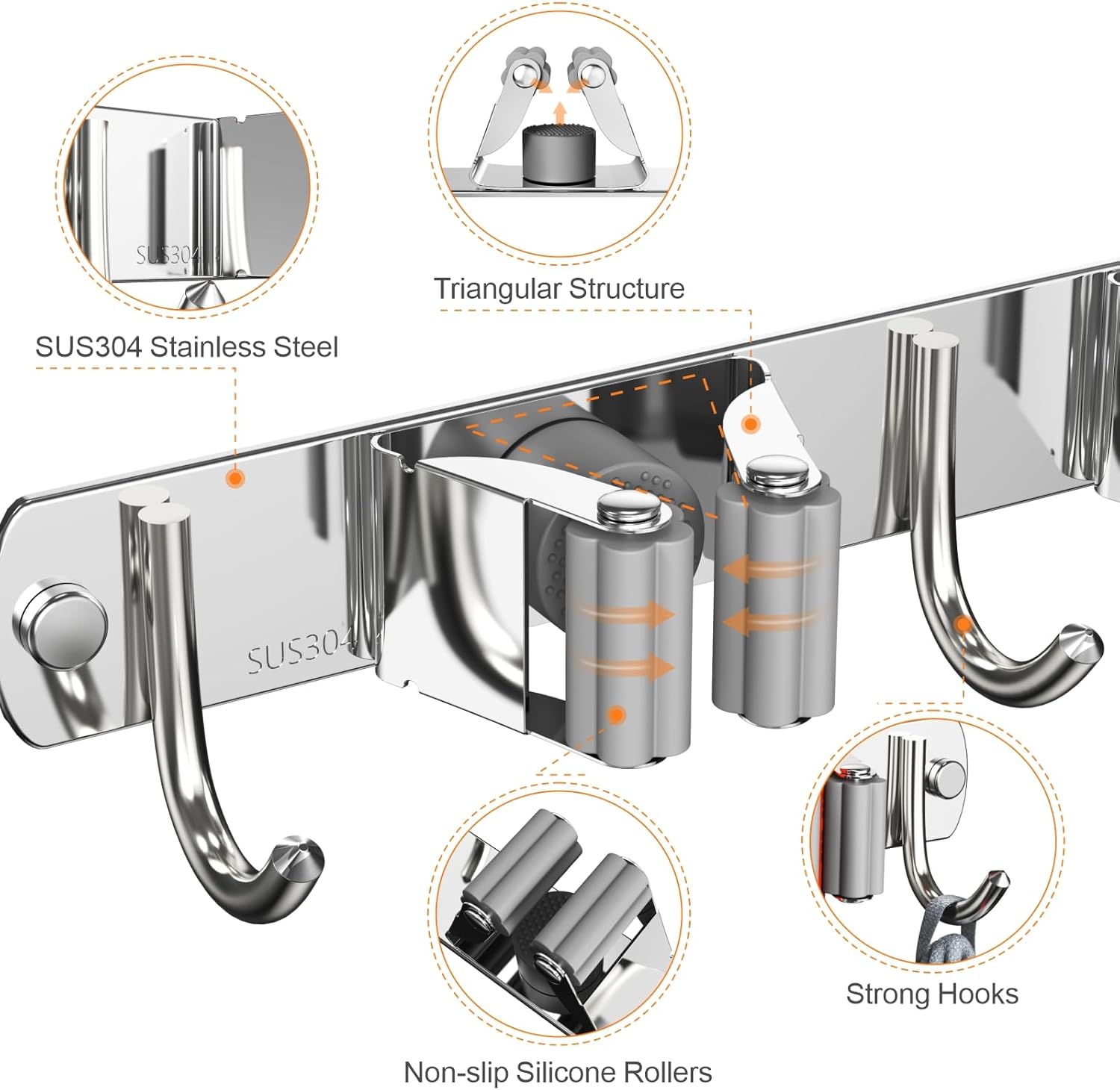 - NON-SLIP DESIGN:The non-slip grips lock secure tools with one-handed push.Mop holder wall mount is designed with triangular construction and softer silicone petal-shaped rollers for a stronger grip. Whether wet mops or baseball bats won't slip