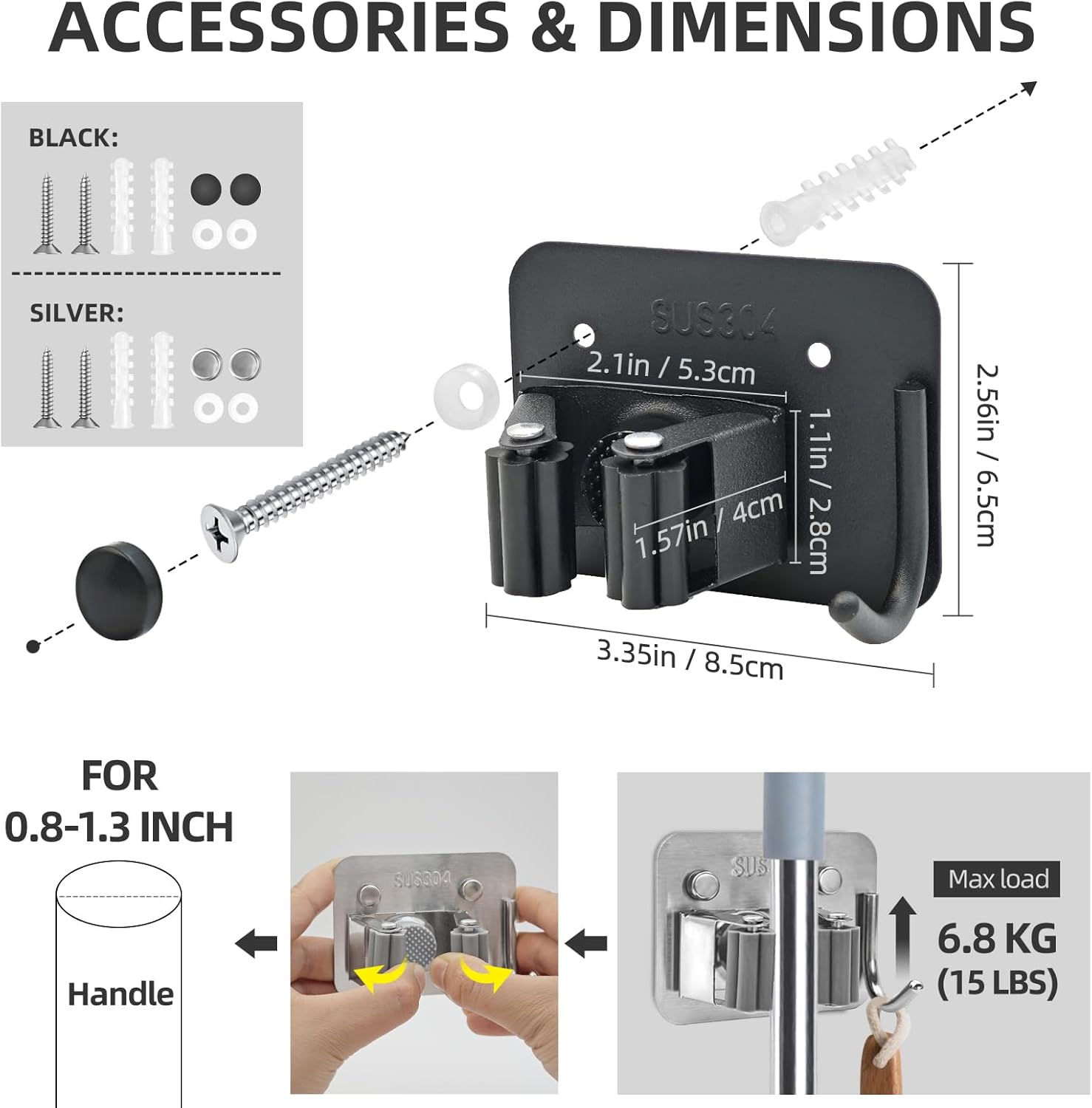 - š§¹ćUtility & AestheticćCrafted from premium 304 stainless steel, this broom rack is durable and also rust-resistant. Our wall-mounted broom hooks can support an impressive weight of up to 15 pounds. In addition, each bracket is equipped with two screw decorative caps of the same color to ensure aesthetics. The sleek silver brushed and black frosted process designed to blend seamlessly into your space.