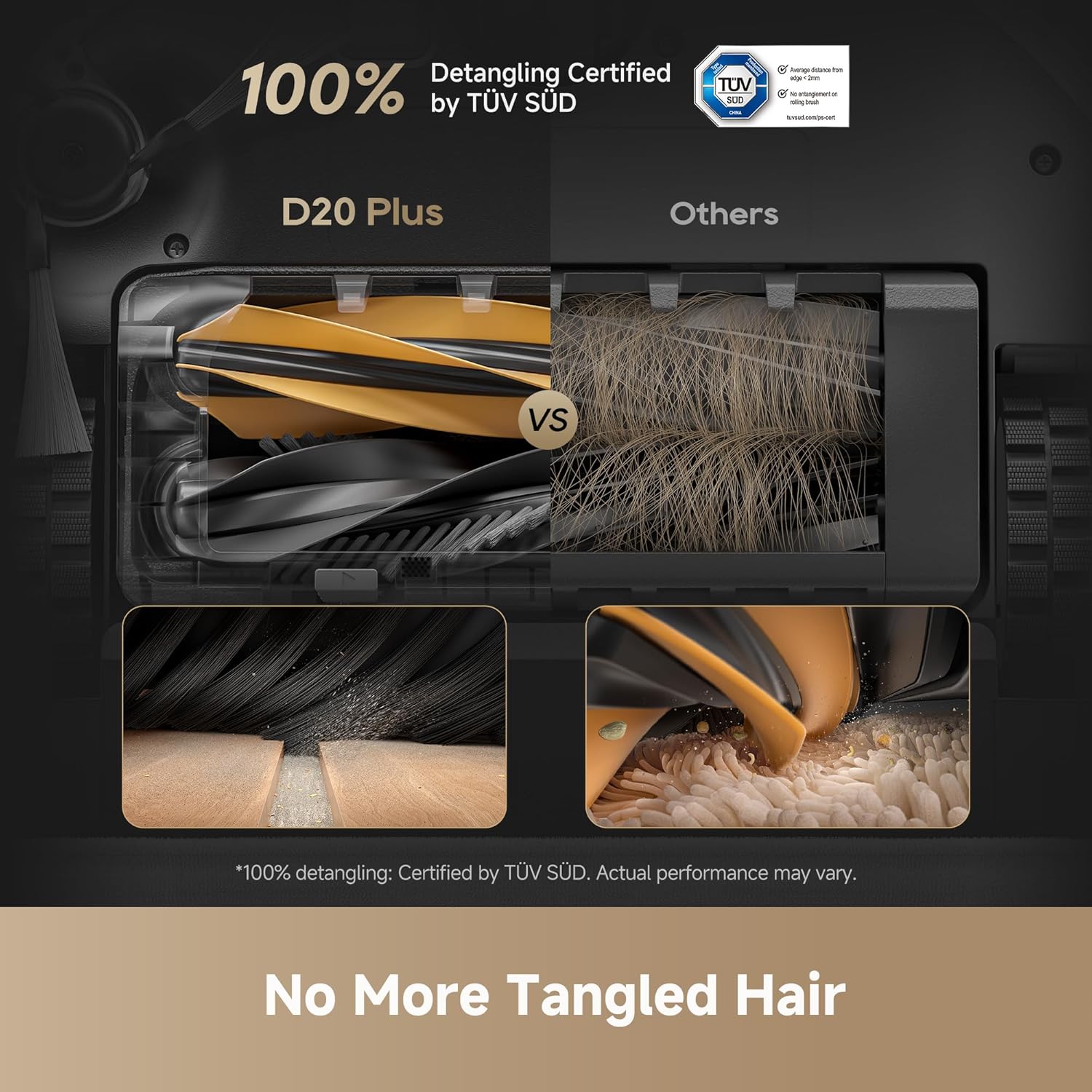 • 13,000Pa Suction + DuoBrush — Say Bye to Tangled Hair D20 Plus comes with 13,000Pa Vormax suction (yeah, that’s super strong), and its anti-tangle DuoBrush grabs long hair and pet fur like a pro—no more messy rollers to clean.