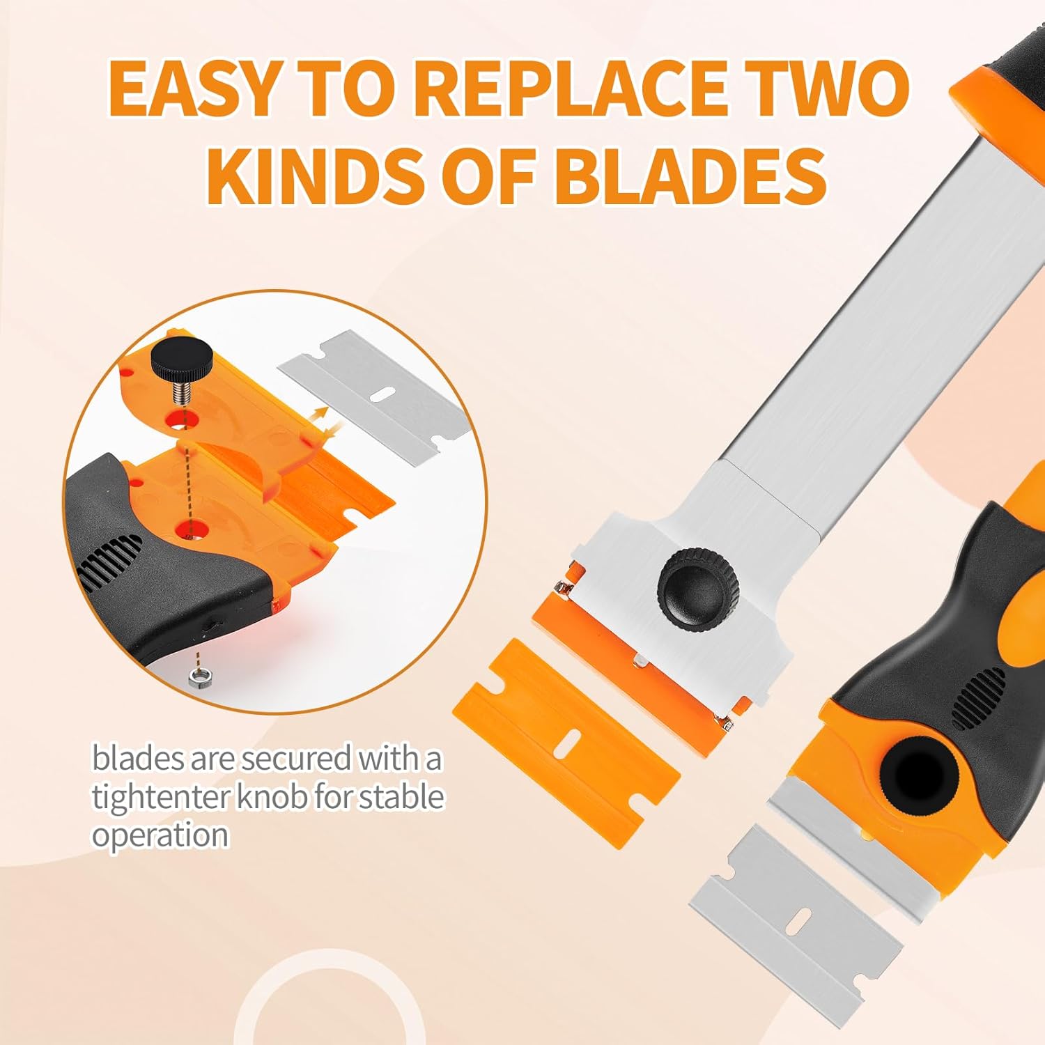 - 【Upgraded Cleaning Tool Set】 You will receive 1 long-handled razor blade scraper, 2 plastic razor blade scraper, 20 plastic blades, 20 metal blades, and an additional 3 wire brushes.Our versatile cleaning tools cater to all your needs, and both the long handle and plastic scraper allow for quick and easy blade replacement without any additional tools—simply loosen the knob, remove the old blade, and insert a new one. Enjoy convenience and efficiency in your cleaning tasks!