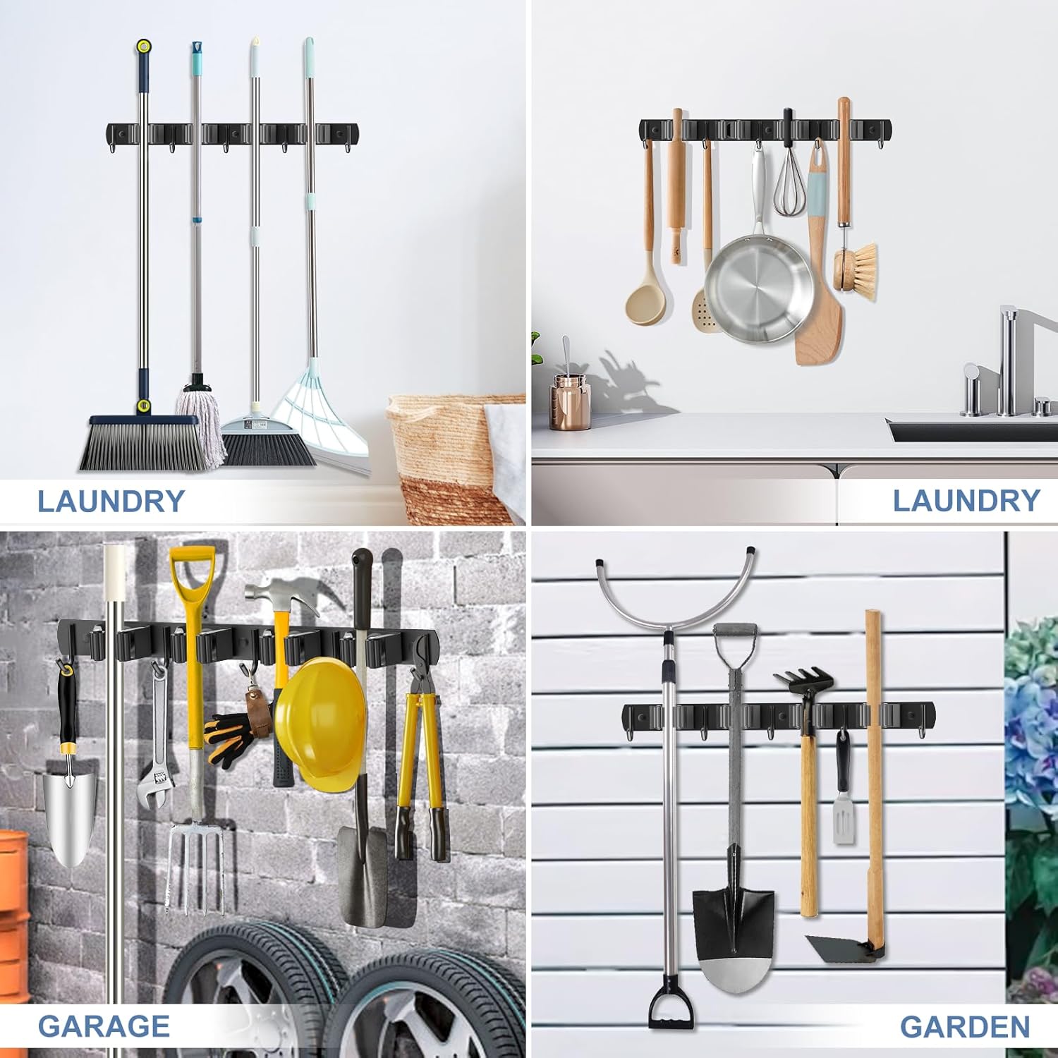 - VERSATILE DESIGN: You can easily organize your home, such as laundry room, kitchen, garage, storage room. This garage organization is also suitable for garden or shed. You can easily use broom, mop, vacuum, dustpan, rake, shovel, etc. Will keep your house clean and tidy