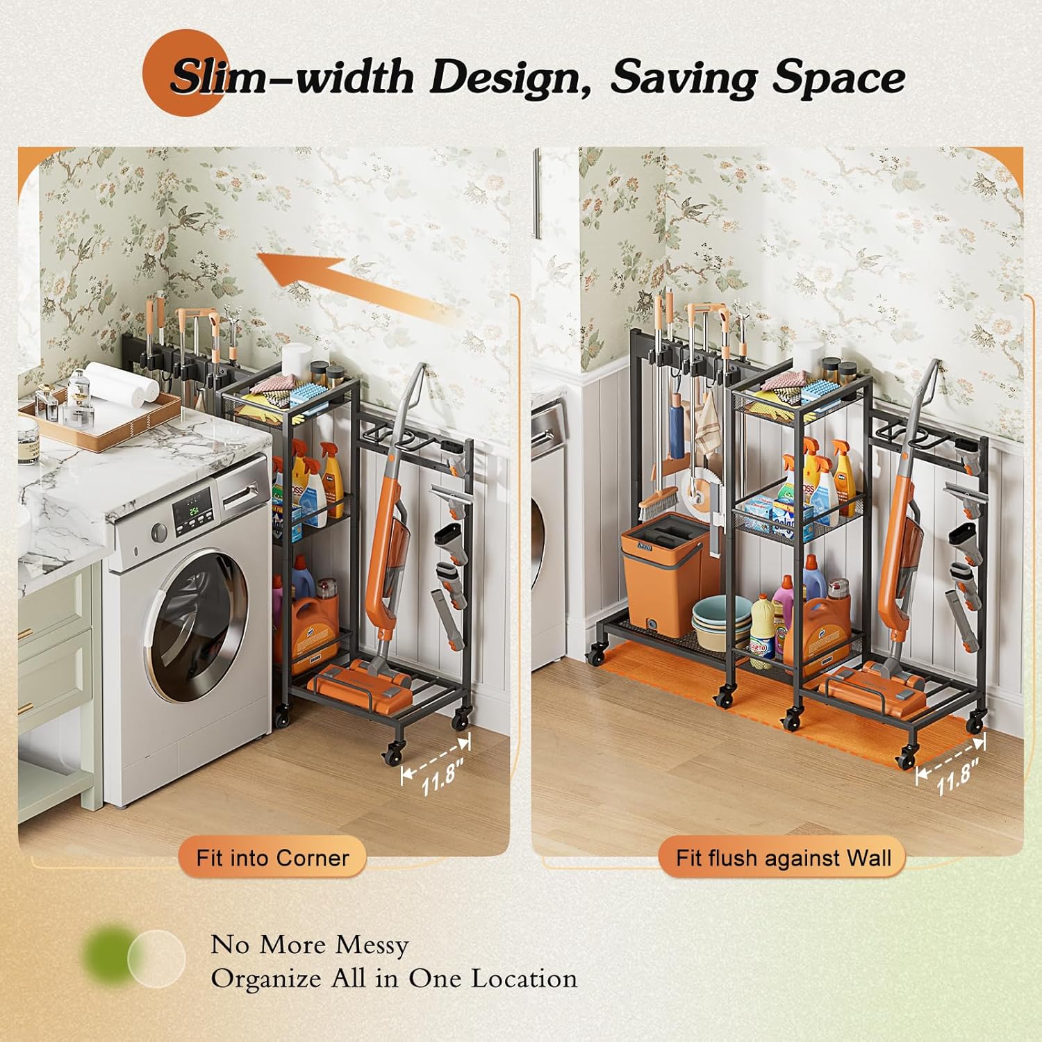 - ăLarge-capacity Broom ClosetăEquipped with 6 broom grippers and 2 double-side hooks for brooms, mops and dusters, the broom rack keeps your most-used tools upright and easy to grab. 3-tier spacious cleaning caddy offers plenty of room for storing sprays, cloths, and other cleaning products, while a dedicated vacuum stand with 5 accessory holder fits most vacuum cleaners. Everything stays organized in one compact, space-saving unit.