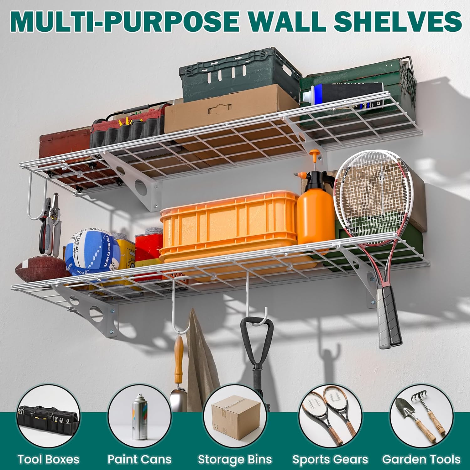 - INCLUDES PREMIUM HOOKS: This wall shelf includes two heavy-duty hooks, each supporting up to 35 lbs—ideal for hanging helmets, shovels, backpacks, and more. These hooks add storage flexibility and make your shelf even more functional and efficient