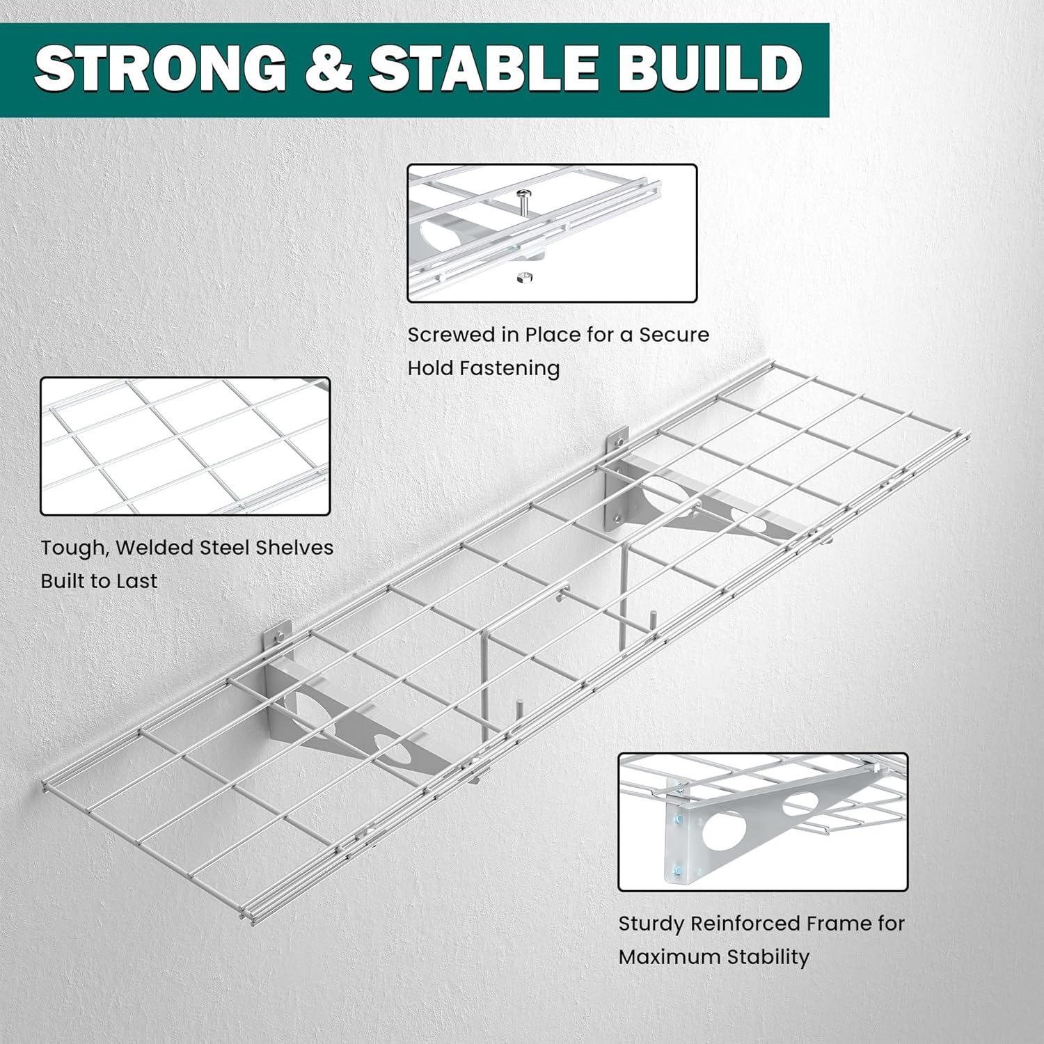 - RUST-PROOF COATED STEEL: Built to last, this wall-mounted shelf is made of high-quality powder-coated steel that resists rust, corrosion. Perfect for garage, basement, and laundry room—even in damp or harsh environment