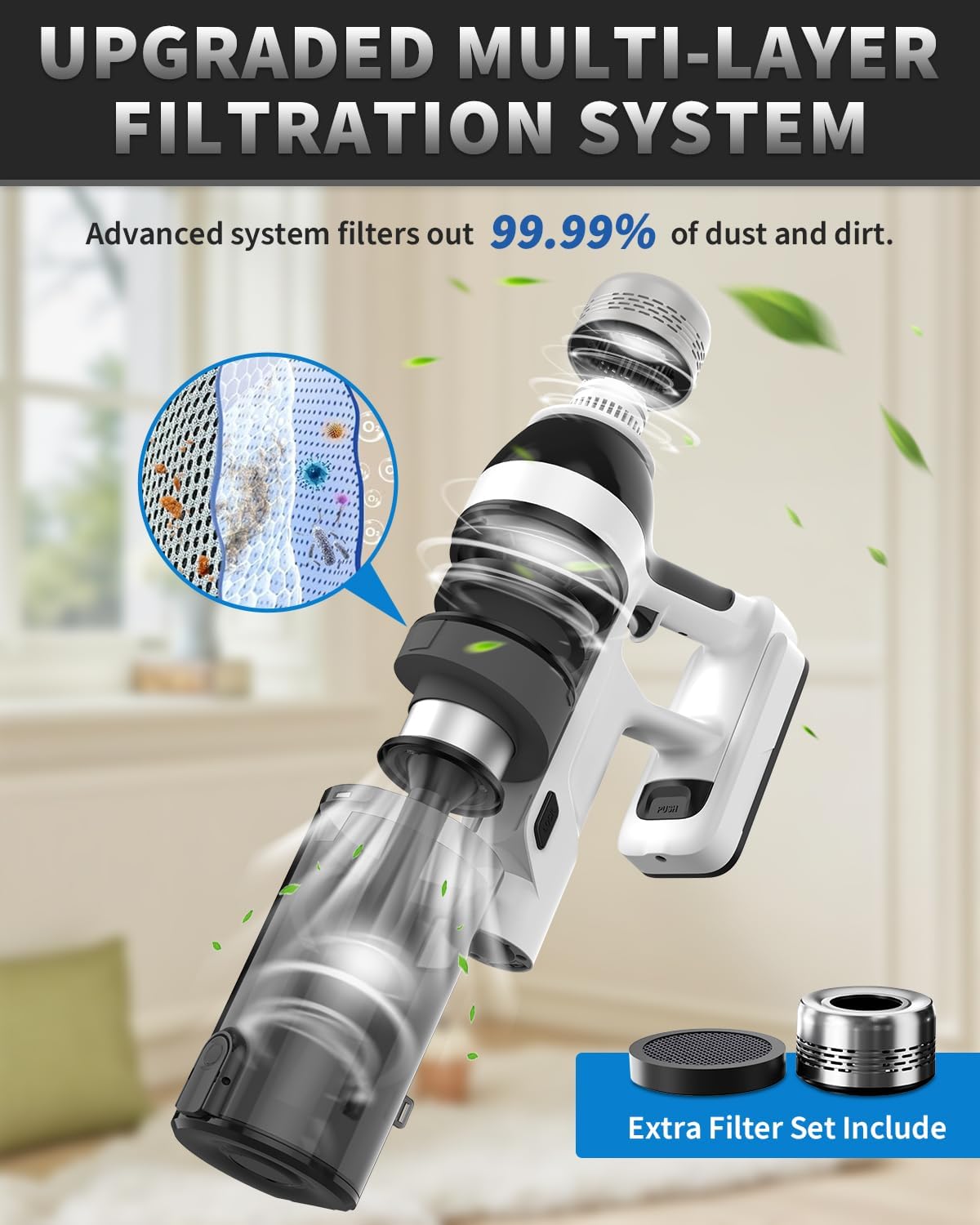 • ★ [Large capacity & efficient filtration] Includes an extra set of spare HEPA filters, The household vacuum cleaner adopts an 8-layer precision filtration system with a filtration accuracy of up to 99.99%, which can capture tiny dust particles with a diameter of 0.1 microns, ensuring a cleaner home and fresher air. The 1.5L large-capacity dust cup can Load more junk. You can empty the garbage with one hand and one click, achieving efficient dust removal.