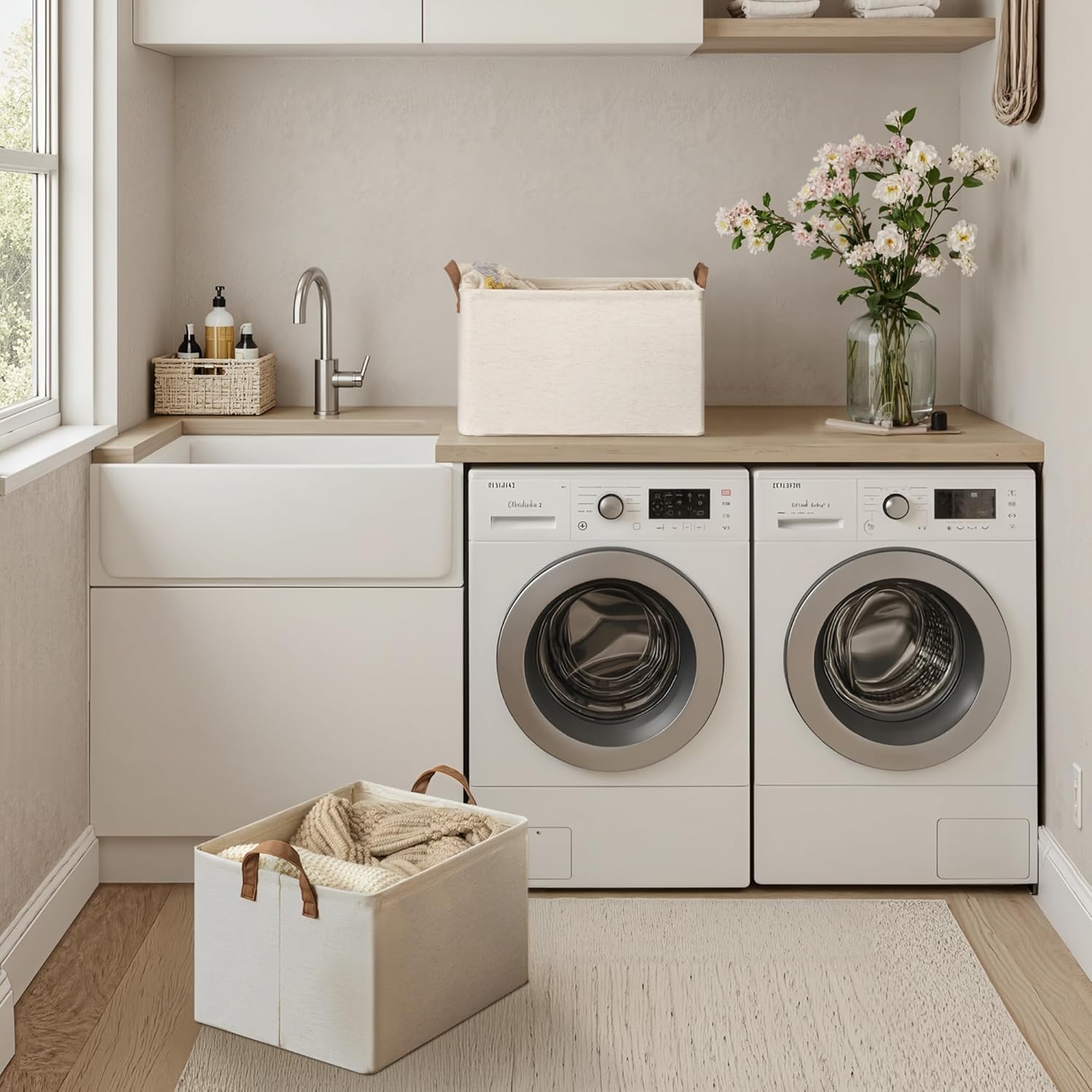 StorageWorks Storage Bins, Shelves Baskets for Organizing, 45L Extra Large Fabric Closet Organizers with Handles, Metal Frame, Beige(Cotton-linen), 2-Pack