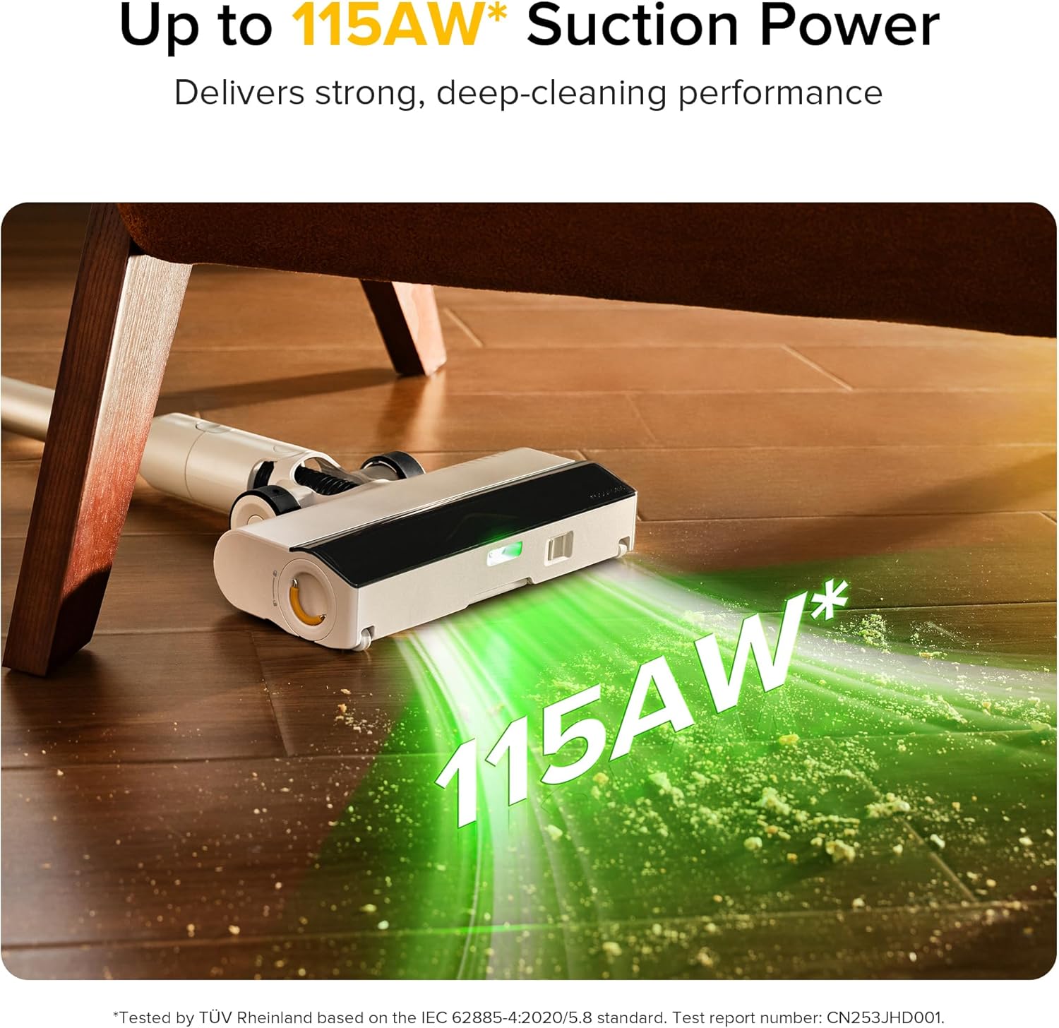 - Effortless Deep Cleaning with 115AW Power: Tackle ground-in debris and stubborn pet hair on carpets and hard floors with 115AW of suction power. The anti-tangle brush of the stick vacuum with a serrated design actively prevents hair wrapping, reducing manual maintenance.