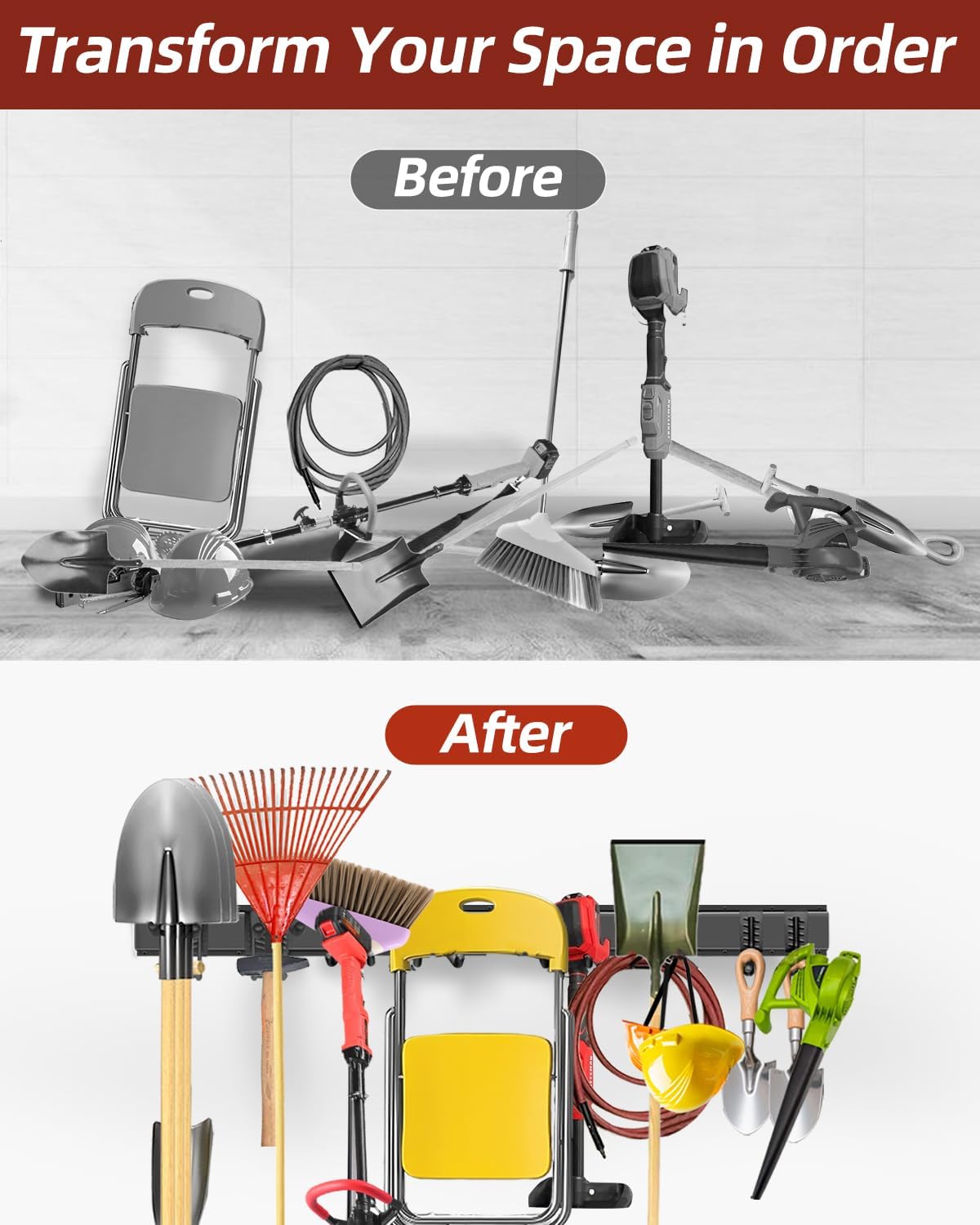 - Package include: Equipped with 8 hooks and 3 rails, this adjustable garden tool holder organizes all your garage / lawn/ garden to save floor space, a must-have for any homeowner looking to streamline their tools and achieve a well-organized space