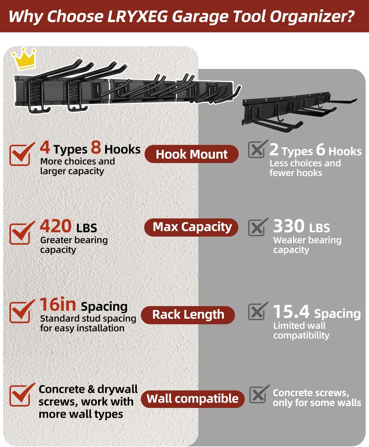 - Built to Last: This garage organization rack made from solid carbon steel for unmatched durability, can totally hold up to about 420LBS. The hooks have a nice soft coating that will protect tools keeps any rattle or annoying noise down