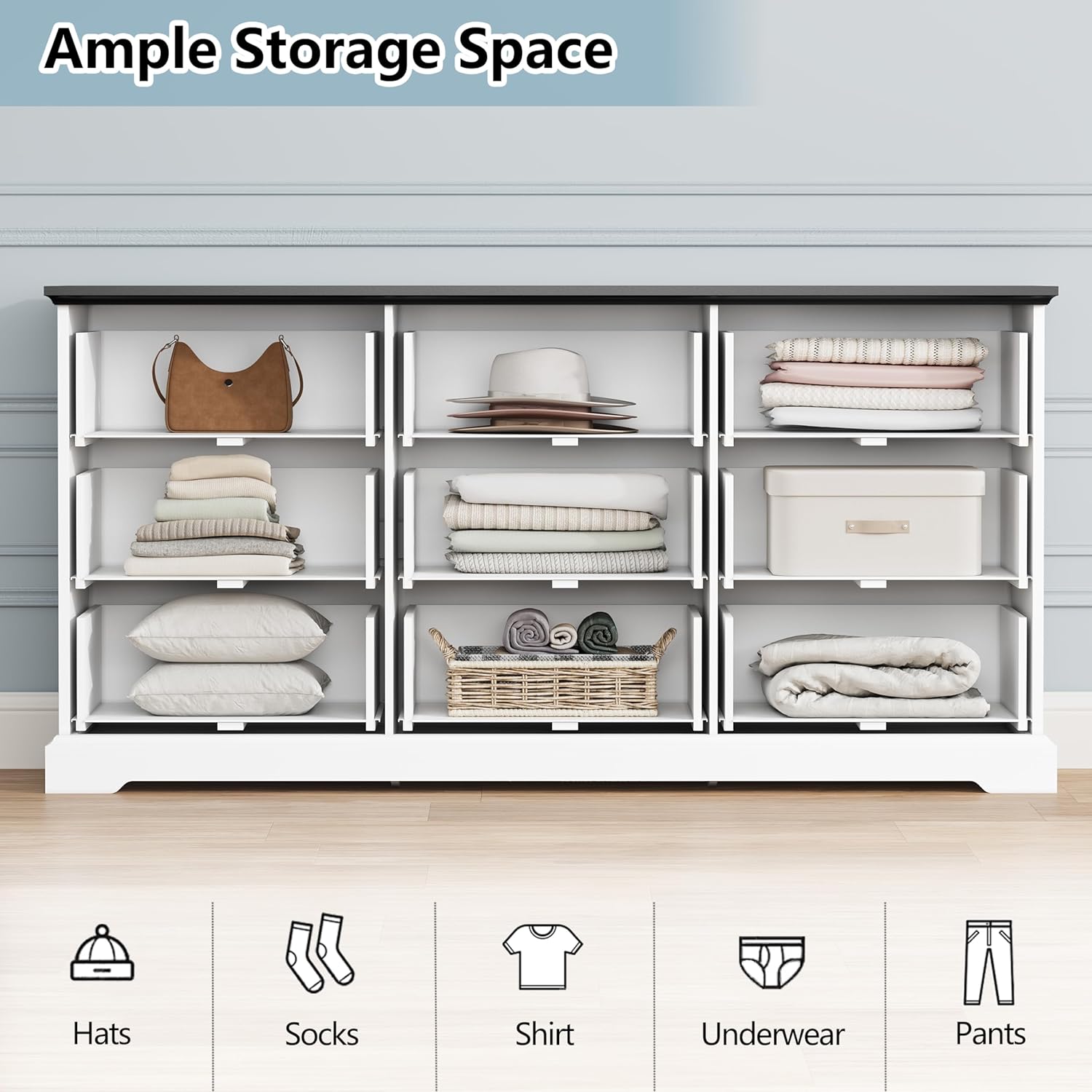 - Ample & Versatile Storage: Measuring 15.75"D × 63"W × 31.1"H, this wooden chest of drawers offers generous storage space with nine spacious drawers, ideal for organizing clothes, bedding, accessories, and daily essentials. It works perfectly as a dresser organizer, storage organizer, or clothes dresser. Whether placed in your bedroom, living room, hallway, or closet, this dresser adapts to your needs while keeping everything neatly sorted.