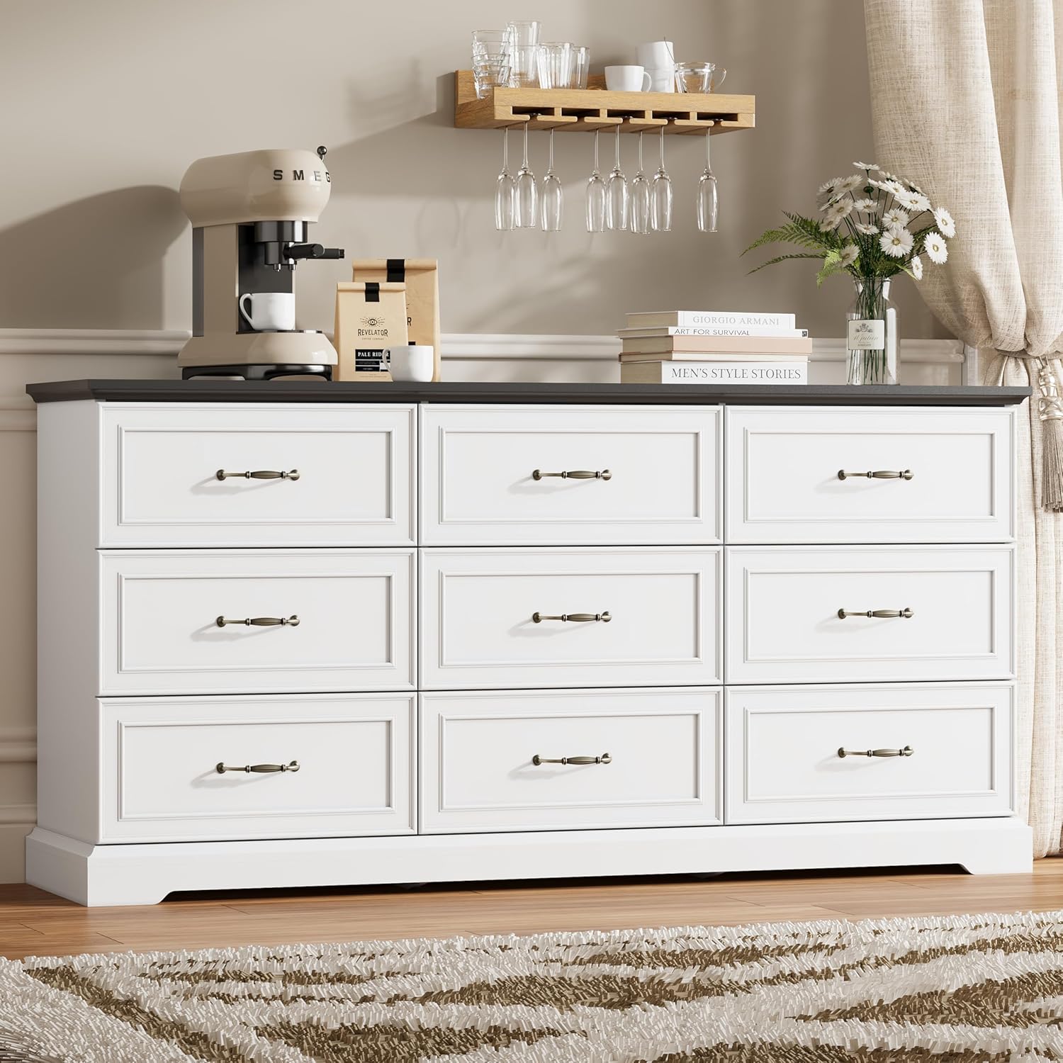 9 Drawer Dresser for Bedroom, 63" Wide Wooden Chest of Drawers, Rustic Farmhouse Dresser with Large Drawers & Metal Handles, Modern Storage Organizer for Closet, Living Room, Hallway, White