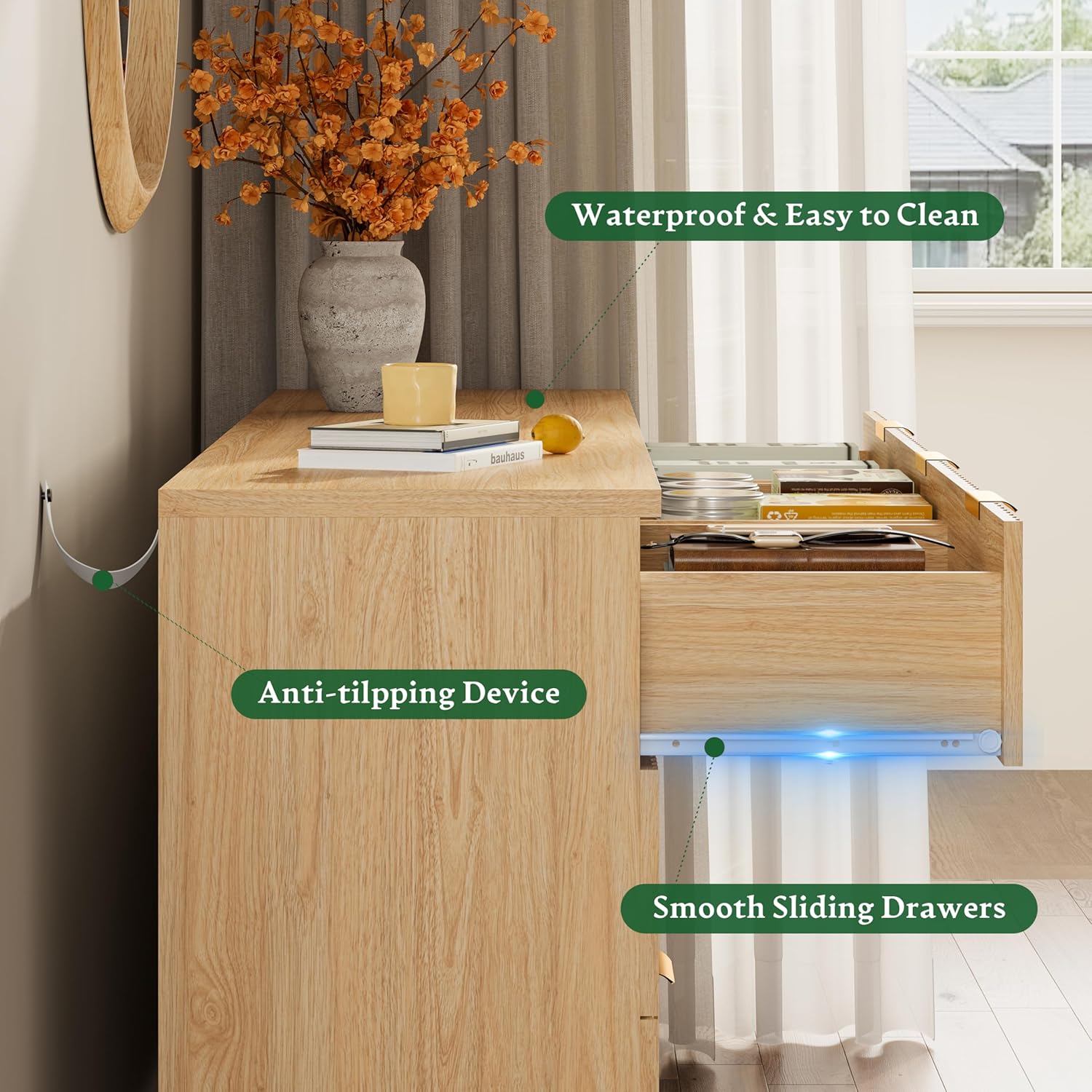 - 【Solid Material & Study Construction】The dressers & chests of drawers are constructed from optimal MDF, P2 engineered wood and coated metal handles which not only have exquisite texture, but also ensure long-term use and are scratch resistant. Each drawer holds up to 25 lbs and the thickened tabletop can support up to 180 lbs. For easy cleaning, just wipe with damp cloth and get it air-dried
