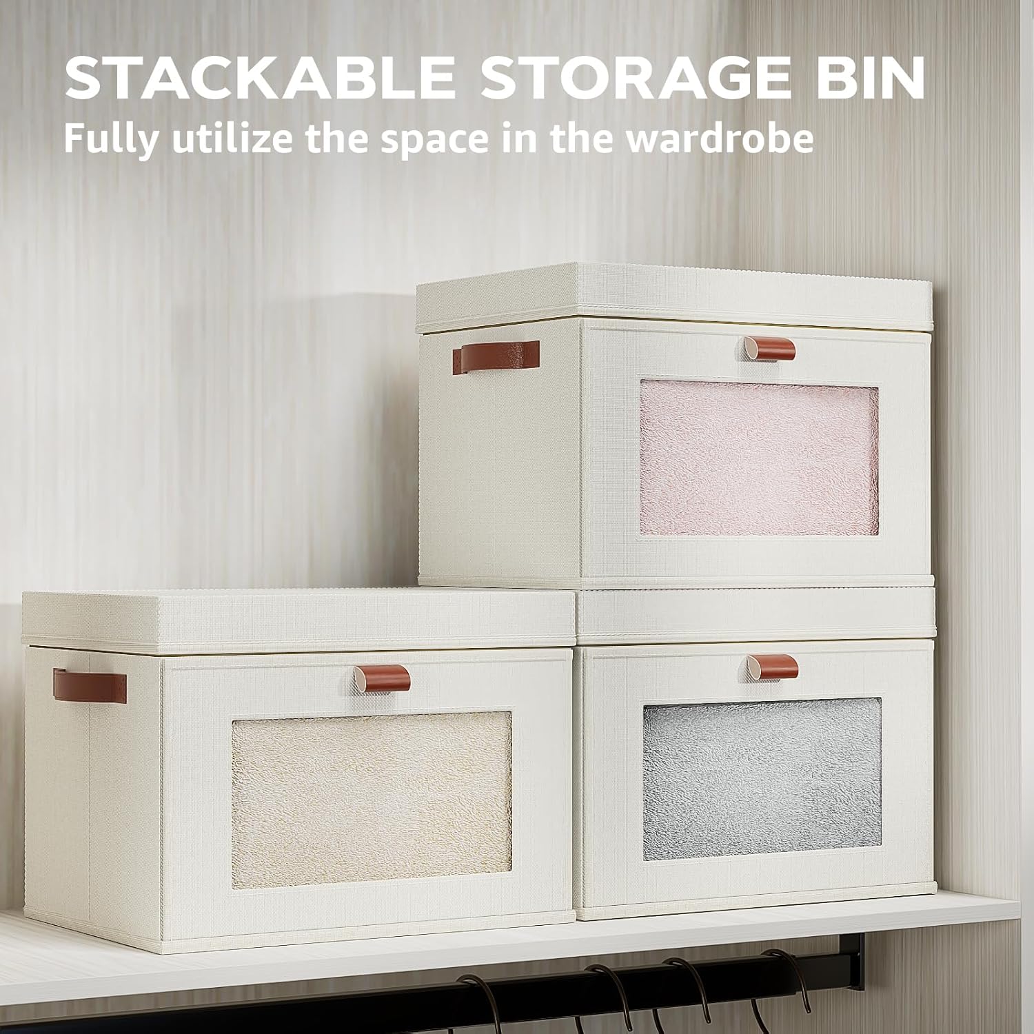 Large Storage Bins with Lids,Stackable&Collapsible Closet Storage Bins,Oxford Fabric Organizer Box with Clear Window,Large Decorative Storage Boxes for Shelves,Wardrobe,Living Room(Beige)