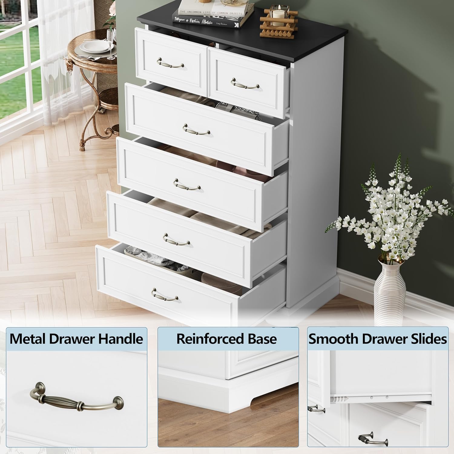 - Ample & Versatile Storage: Measuring 48.62"H × 15.75"D × 31.5"W, it features two smaller top drawers and four larger bottom drawers, providing the perfect combination of organization and accessibility. The top drawers are ideal for jewelry, accessories, or smaller essentials, while the spacious bottom drawers accommodate clothing, bedding, or bulkier items. Perfect as a tall dresser organizer or a storage dresser for bedrooms, closets, hallways, or living rooms, it keeps your items neatly sorted and your space elegant.