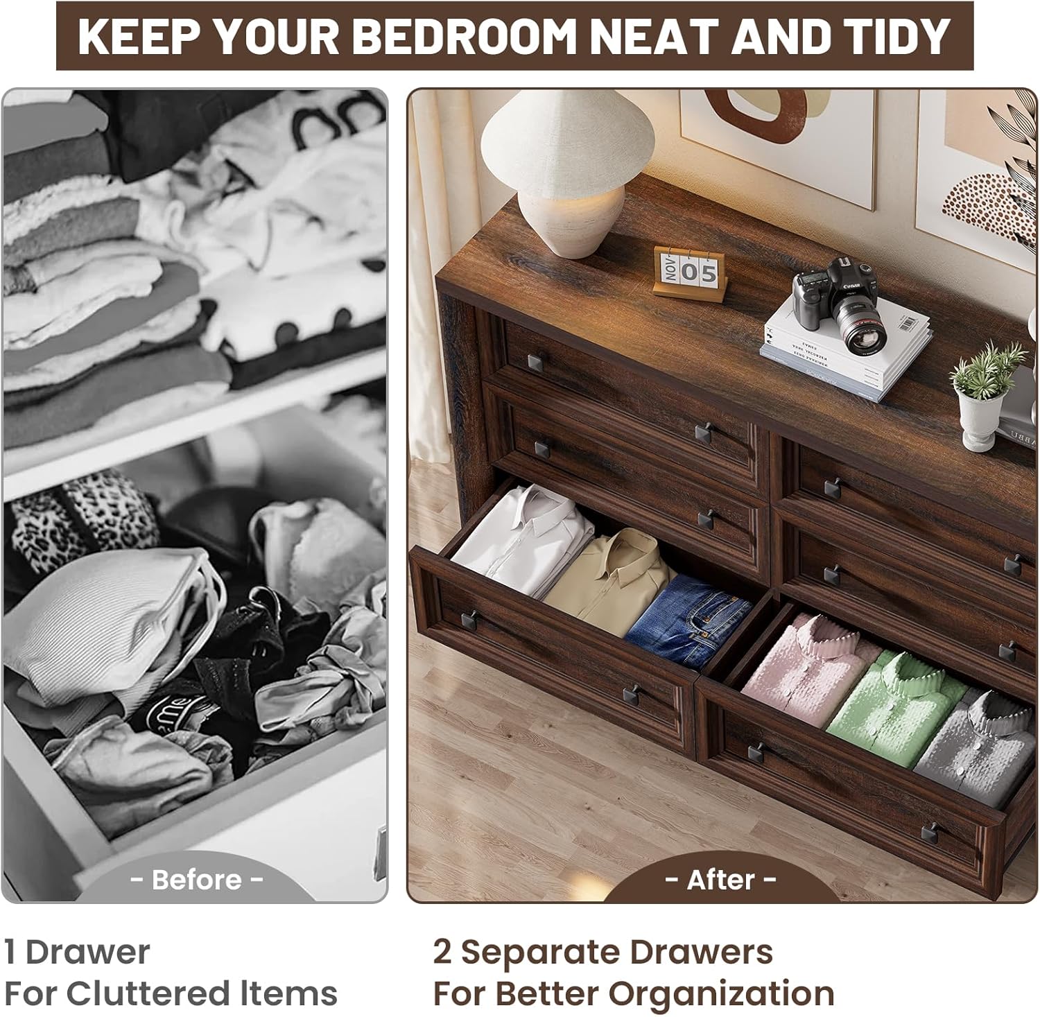 - Large 6 Drawer Dresser: Measuring 52.4" W × 15.4"D × 32"H. Standifurno walnut dressers for bedroom boasts an immense storage capacity - 6 smooth glide drawers, providing versatile storage for organizing items such as shirts, underwear, socks and toys. The spaciou s tabletop is ideal for lamps, decor, or photos. This wooden drawer chest dresser emerges as the quintessential choice